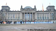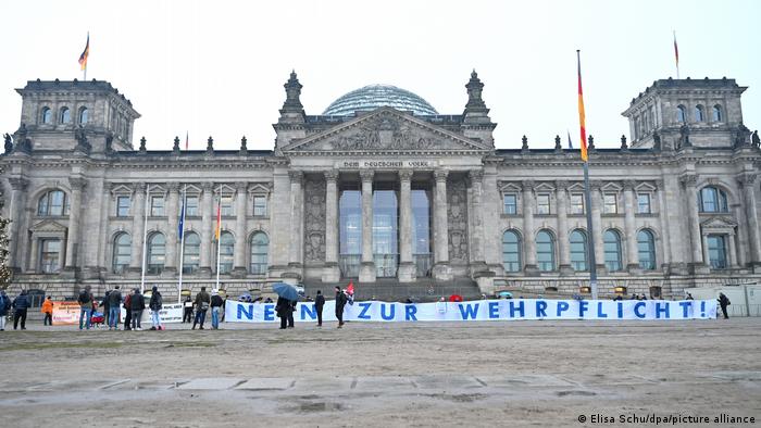 | Image caption | Arşiv - Almanya'da zorunlu askerlik hizmetine karşı çıkanlar, federal parlamento binası önünde de olduğu gibi çeşitli yerlerde gösteri düzenliyor | ||