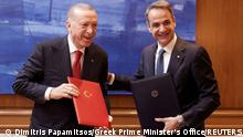 | Image caption | U to vreme, znaci su još uvek ukazivali na popuštanje napetosti: 7. decembra 2023. godine, turski predsednik Erdogan (levo) i grčki premijer Micotakis potpisali su u Atini sporazum o dobrosusedskim odnosima | ||