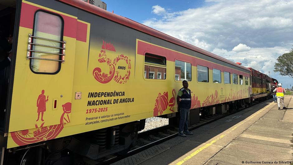 50 Jahre Unabhängigkeit: Dieser in den angolanischen Nationalfarben lackierte Eisenbahnwaggon verkehrt auf dem "Lobito-Korridor" - einer 1.300 Kilometer langen Bahnstrecke, die Angolas Küste mit dem Inneren des Kontinents verbindet