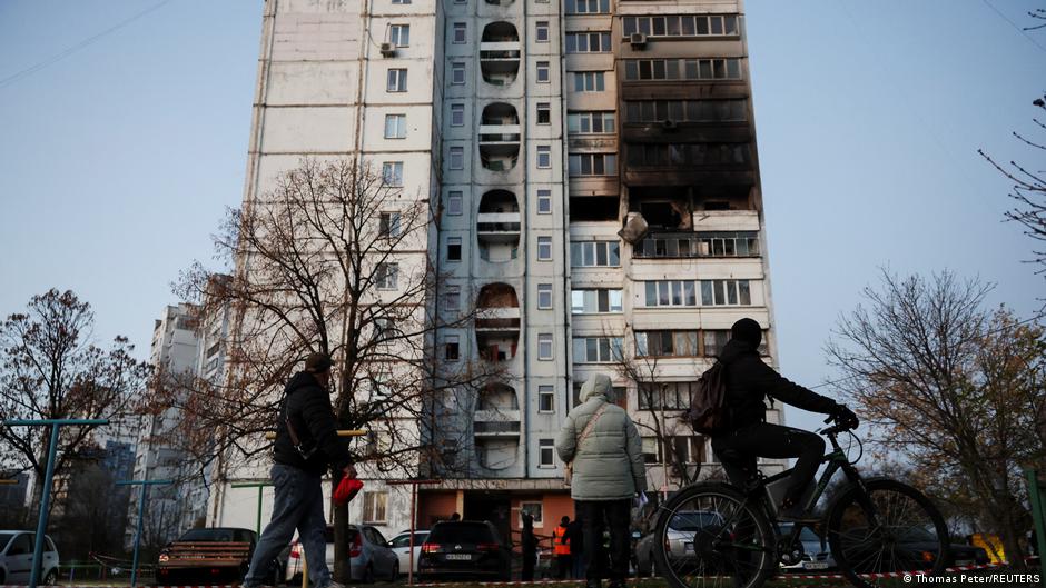 Ein beschädigtes Wohnhaus in Kyjiw nach russischen Angriffen in der Nacht